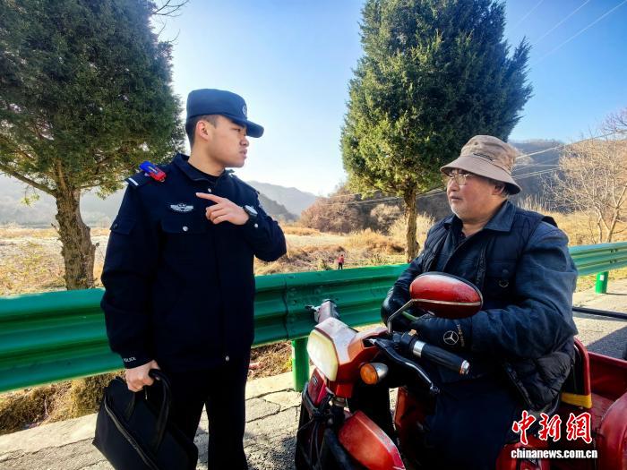 图为西安铁道公安处秦岭站派出所平易近警以推家常的方式背村平易近启铺线道法治宣扬。王小东 摄